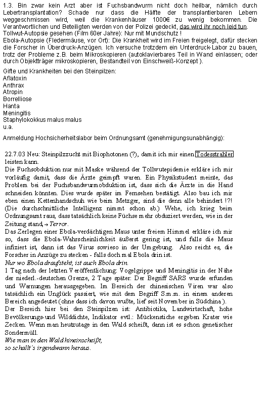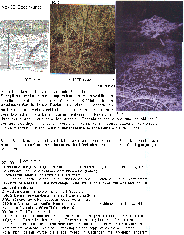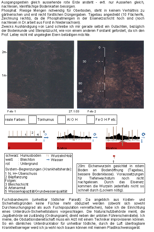 Fotos 11.8.03, Regenmangel (30cm fehlen) Links oben: gleiche Perspektive wie oben, Hügel bei knapp 2m abgeflacht (begehbares Plateau), Gründüngung nur 2,2m statt 4m (Regenmangel, und obere Hälfte des Hügels besteht fast nur aus Unterboden und frischen Fichten) Rechts: Rückseite. Vorne Kräuter in 10cm Humusboden auf Rostband (tiefste Stelle, keine N-Ausschwemmung), freiliegender Boden ist Unterboden mit 5cm Humus und Bedeckung, Pflanzen-Sukzessionen noch klein, auf Foto nicht erkennbar. Der freiliegende Boden im Ausschnitt liegt nur deshalb frei, weil hier 80% der Kräuter entfernt wurden. Links unten: Bodenbildung 3m vor 15m hohen Fichten. Ausschnitt: Trockenschäden (braune Blätter von Birke und hängende Gründüngung), nicht durch Regenmangel und späte Bodenbedeckung erklärbar. Die vermuteten Fichtenwurzeln wurden dann tatsächlich gefunden, auf 4m Breite, in 50cm Tiefe, 30cm unter einem Abstichgraben, teils unter einer Steineschicht in ungestörtem Boden. Der ausgehobene reine Tonboden (teils unbearbeitet) war trocken, extrem leicht, im unbearbeiteten Anteil durch Seiteneffekte angebräunt und mit 10% vertorfenden Holzbrocken (verbesserte Humusbildung durch nahen Dünger), und kann 50cm Bodengare bilden. Das Pulver ist so noch nicht für den Einsatz von Steinpilzbrut geeignet, aufgrund des extremen chemischen Gemetzels (Tonhumus-Entwicklung noch im Gange): Branntkalk, Salpetersäure, Mikroben, Phosphat, evtl. Ammoniak, Magnesiumsulfat, Aluminium etc. Ozon auf dem Foto ca.220. Ab ca. 280 konnte ich es riechen und die Arbeit fällt schwer, besonders bei Temperaturen über 30° und hoher Luftfeuchtigkeit (Insekten, “Flugzecken” etc.). So ein Pulver wurde z.B. aus der Sahara nach England geweht, so dass dort die Maul- und Klauenseuche ausgebrochen ist (neuentdeckte vermutliche Ursache). Aufgrund des Hügels wird jedes Fulda-Hochwasser 1 m³ kleiner, und der Edersee spart in jeder Trockenzeit 100L Wasser (oder mehr, je nach Lage des Hügels). Nebenprodukt wählbar, z.B. Steinpilzbeet, oder es können sich 0,02 Luchse von dem Hügel ernähren. Die Patenthügel sind noch in der Entwicklung, die Anzahl wird davon abhängen, ob die neuen Waldarbeiter den Reichen genügend Geld abknöpfen können. |