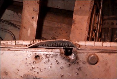 Dokumentation Durchschusskanal Militärbericht cheniere.org 1.Einschlag in Kettenschürze hinter Schütze (verdeckt durch weißen Zettel) |